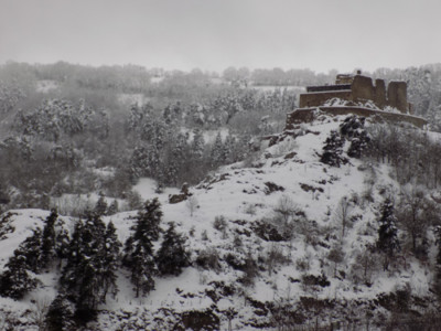 L’église et son clocher si coloré avec ses tuiles polychromes, le château de Beaufort qui surplombe la vallée,
